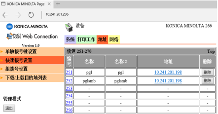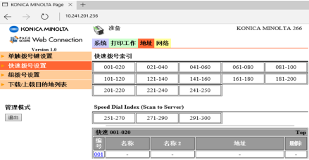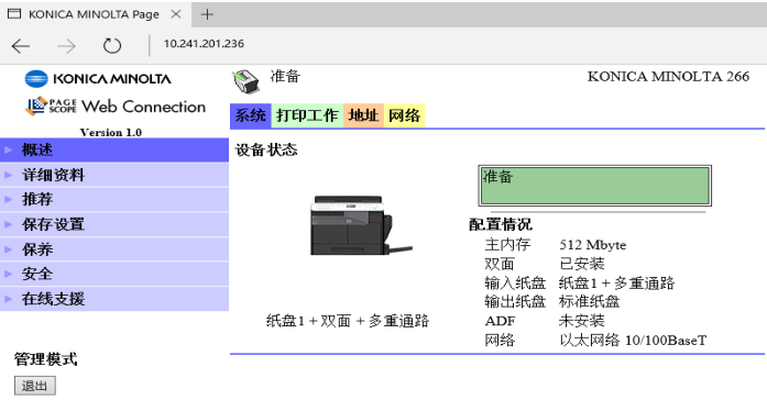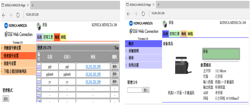 1)PC中打開(kāi)IE輸入MFP的IP地址,通過(guò)PSWC進(jìn)入管理員模式(管理員密碼:sysadm)